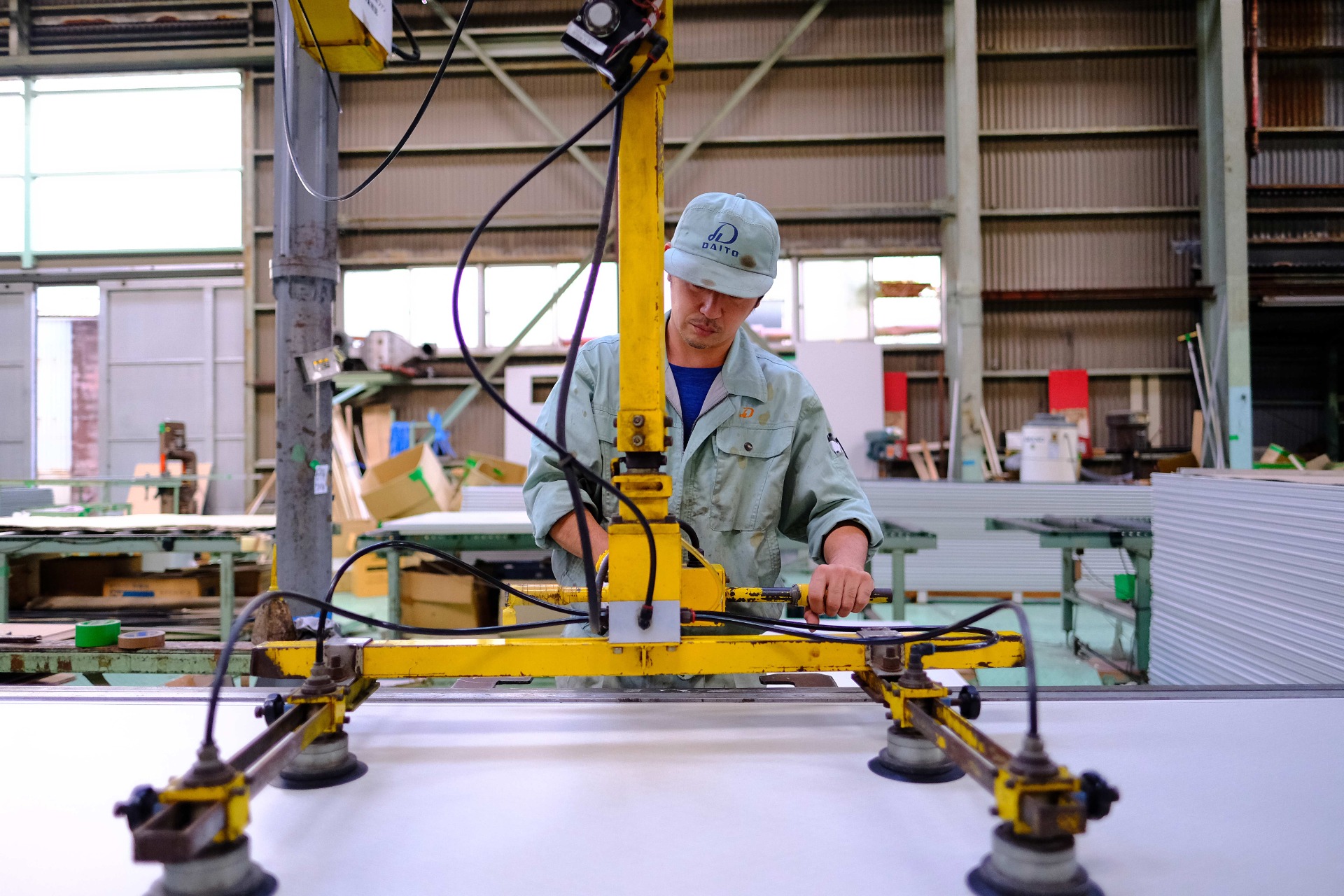 Q.仕事内容は? 主に2つの作業を行っています。 1つ目は、仕様通りにサンドイッチパネルを 組み立て、注入、梱包する作業。 強度や性能を上げるために、2枚のパネルを貼り合わせます。 2つ目は、型に合わせて鋼板などを変形させるベンダー作業。 お客様の要望や仕様書に合わせて、 mm単位で成型・化工を行います。