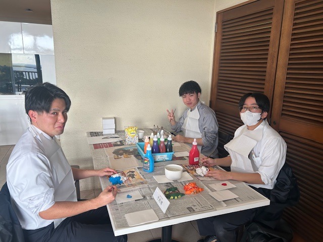 内定者研修では、将来の目標や、アクティビティ体験(シーサー絵付け)、イルミネーション点灯式、夕食(中華レストラン)、宿泊体験と