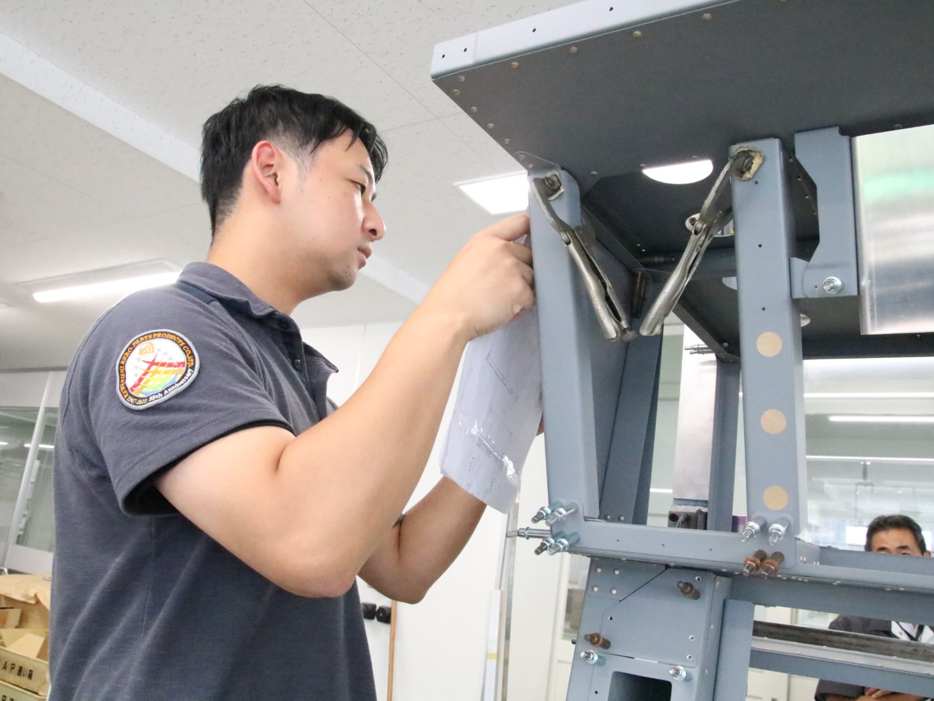 ┗板金加工をはじめ、リベット、かしめ、締結、接着等、背丈を超えるものから手の平サイズまで様々な各種組立作業を行います。