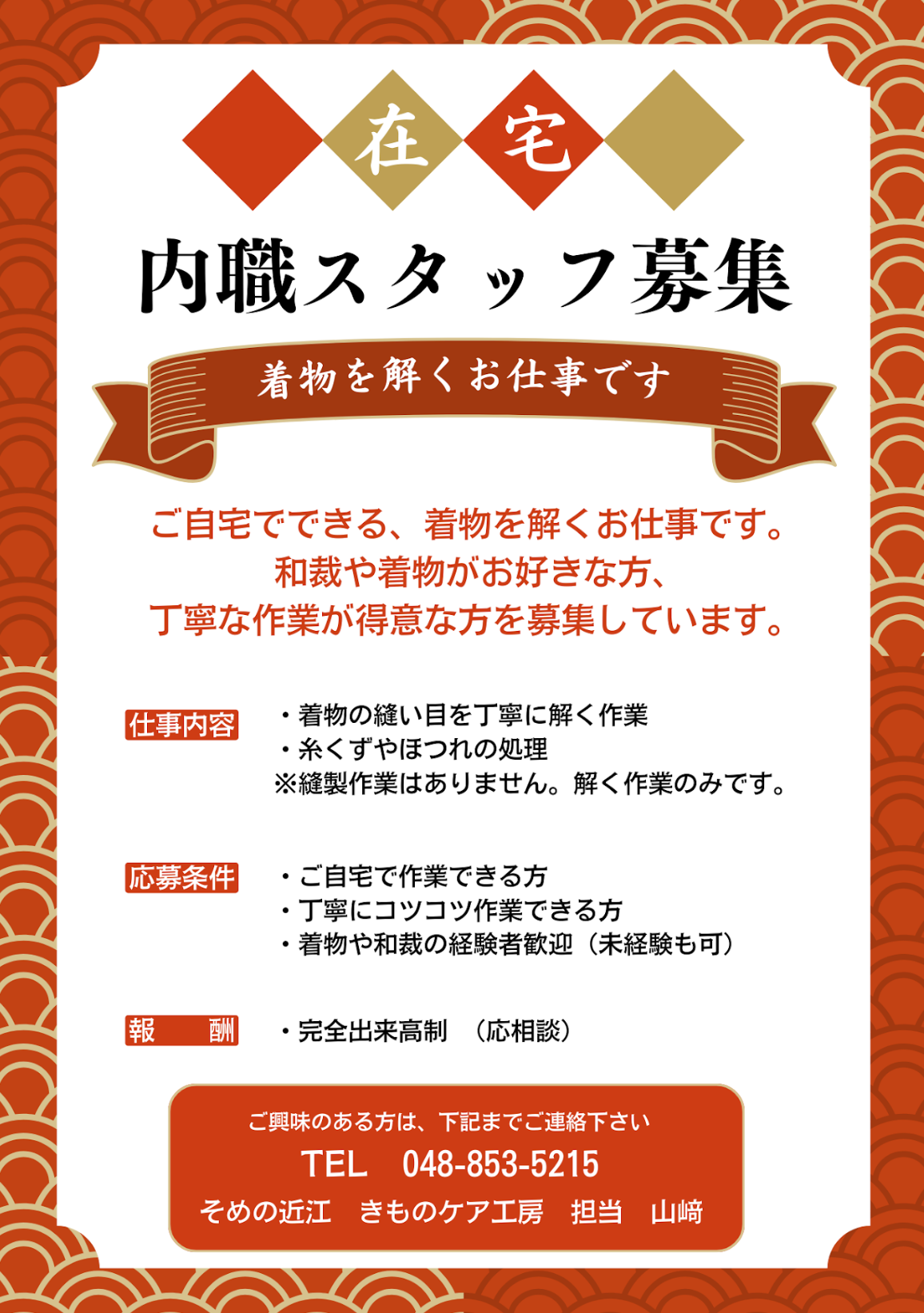 内職スタッフ募集(着物を解くお仕事) 2026-03-02 06:56:43 UTC 🌸 内職スタッフ募集(着物を解くお仕事)🌸 ご自宅でできる、着物を解くお仕事です。 和裁や着物がお好きな方、丁寧な作業が得意な方を募集しています。 ■仕事内容 ・着物の縫い目を丁寧に解く作業 ・糸くずやほつれの処理 ※縫製作業はありません。解く作業のみです。 ■応募条件 ・ご自宅で作業できる方 ・丁寧にコツコツ作業できる方 ・着物や和裁の経験者歓迎(未経験も可) ■報酬 ・完全出来高制 (応相談) ご興味のある方は、下記までご連絡下さい TEL 048-853-5215 そめの近江 きものケア工房 担当 山﨑