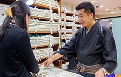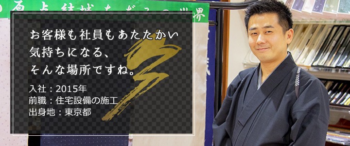 入社するきっかけは、「和服が好きだから」でも「接客が好きだから」でも大丈夫。教育面はもちろん、お客様に対しても営業・経理・仕立ての担当がチームプレーでご案内する当社なら、きっと得意なことを活かして活躍できるはずです。だからこそ、一緒に働くことになった時は、一人で抱え込まないでほしいんです。分からないことはすぐ質問。困ったときはすぐ相談。そんな社内のコミュニケーションを大切にしてほしいです。