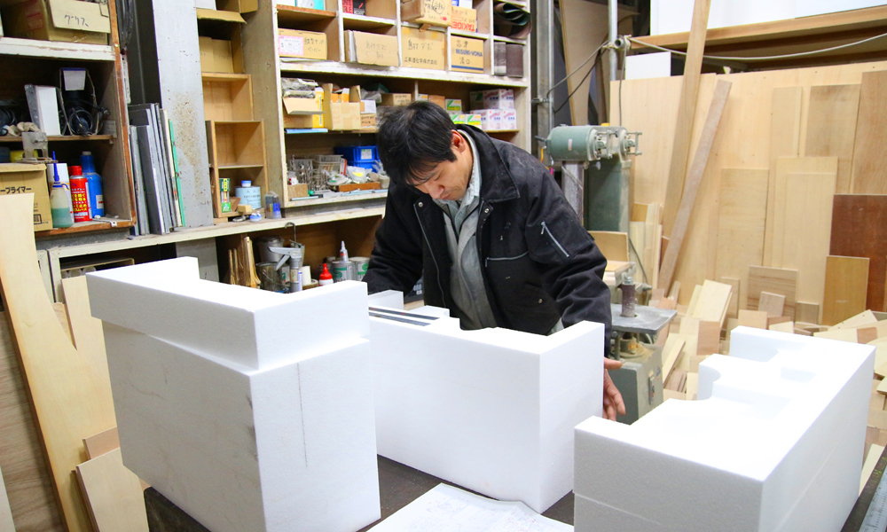 もともとモノづくりが好きだったことと、実は前職が鋳物屋だったこともあって、多少なりともその経験が活きればよいなという気持ちで入社したんです。僕が今携わっているのは、公共事業なんかで使う鉄管や水道管の型。基本的には発砲スチロールを使って材料を作ったり、鉄管につける部品を作っています。機械を使うというよりは手で実際に切ってくっつけたりということが多いですね。