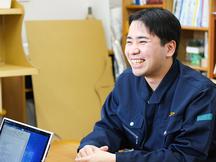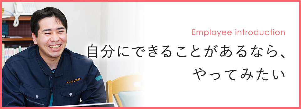 以前勤めてい会社の上司が、そこを退職後に「ペーパークラフト」で働いていたんです。ちょうど1年くらい後に自分も退職を考え始めたタイミングでその上司から声をかけていただき、やりたいことや夢もなかった自分を誘ってもらえたことで「自分にもできることがあるならやってみたい」という気持ちが芽生え、入社を決意しました。今は箱の製造に携わりながら様々な経験を積んでいます。