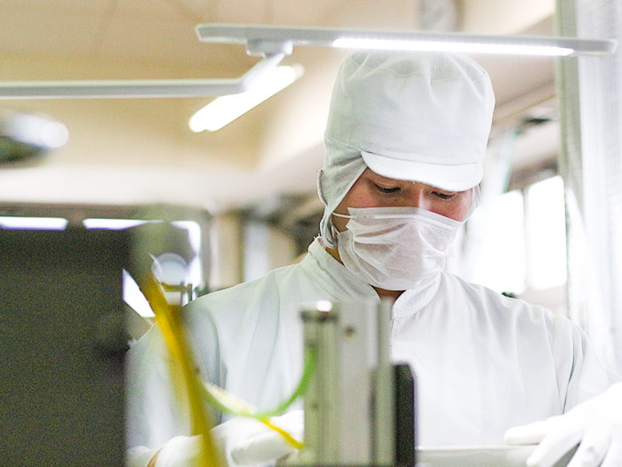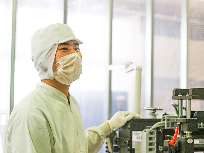 製造と一言で言っても、完成するまでに様々な工程があって、私自身今の部署は入社してから3箇所目になります。最初は製品の数を数えて袋に入れ、段ボールに詰めるといった作業からスタートし、そこから不要な箇所を切り取る作業、フィルムを貼る作業など少しずつできることが増えています。基本的にメインの仕事はありますが、余裕があるときは足りない部署に入っているのでいろんな経験を積むことができる環境です。新しい方が入ってきた時には、早く慣れるようにサポートするので、一緒に頑張っていきたいです。