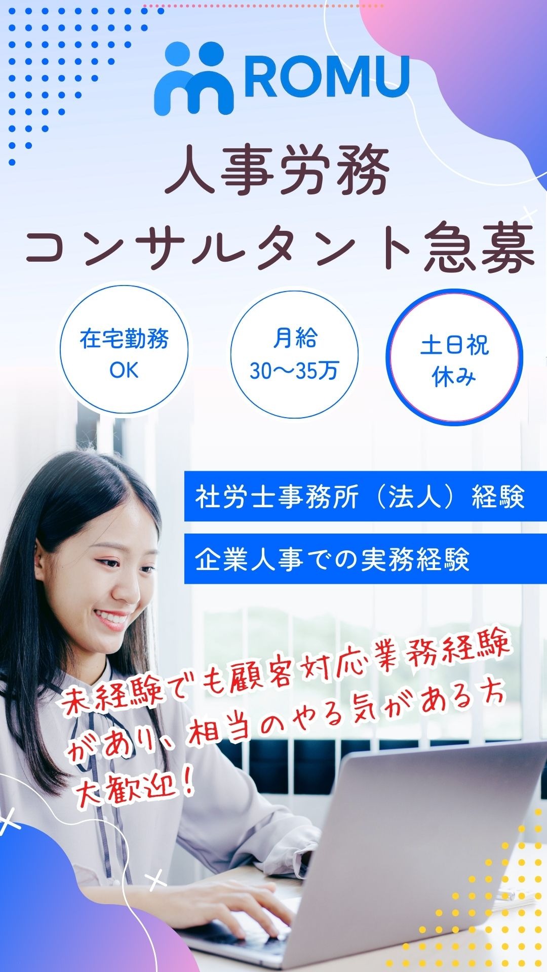 ROMUは人材紹介や採用代行、労務のアウトソーシングを通じて、企業様の人手不足解消を全力でサポート。人材に関するお悩みに、ワンストップで応えます。求人媒体の選定から書類選考・一次面接の代行、外国人特定技能者の就職サポートなど、企業・求職者に寄り添い、多角的な支援を展開。数多くの企業様の人事の“リアル”を把握するからこそ、ズレのないマッチングを実現しています。企業様と求職者の架け橋となり、互いに幸せな結果を生むことを目指し、これからも、皆様の「困った」を解決するパートナーとして、信頼されるサービスを提供し続けていきます。