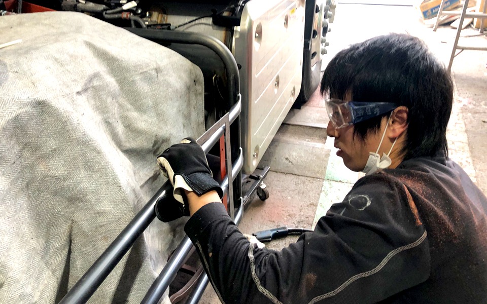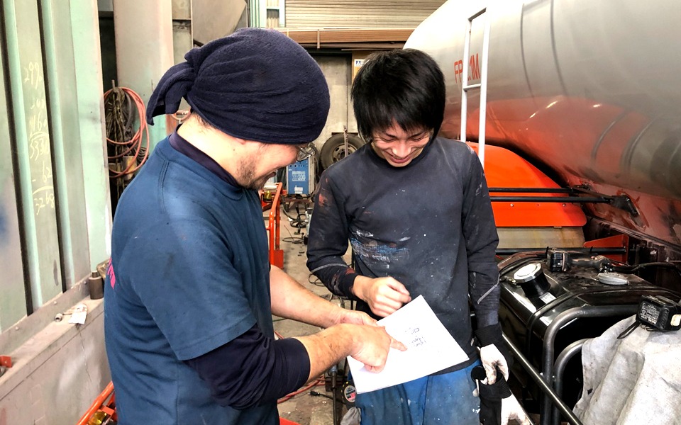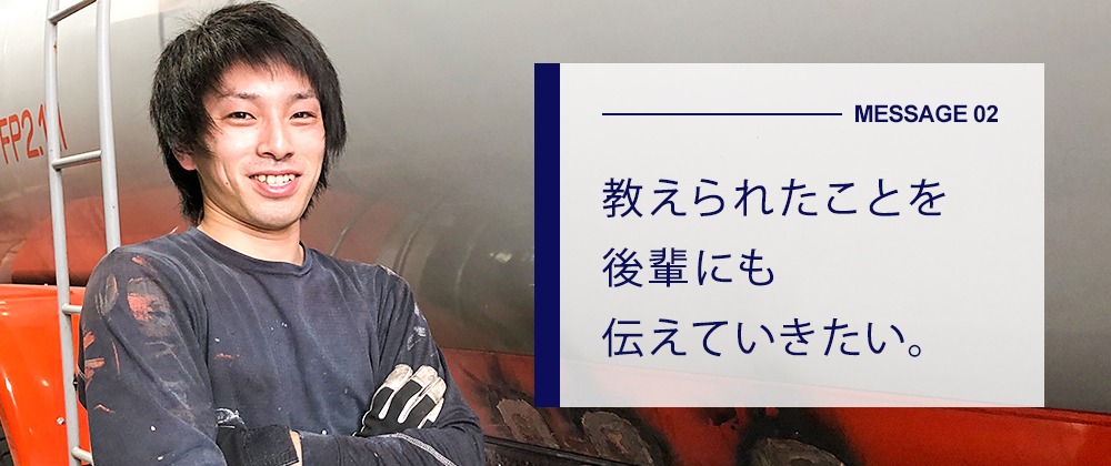 現在大型車両部で、タンクローリーの検査をメインに行っています。具体的にはタンクローリーの付属品一つひとつを検査し部品交換をするなどのメンテナンスを行っています。 タンクローリーという大型で且つ一般車両とは違う専門性を要する仕事なので替えの利かない仕事をしているという実感ができ、自分の仕事に自信が持てるようになりました!