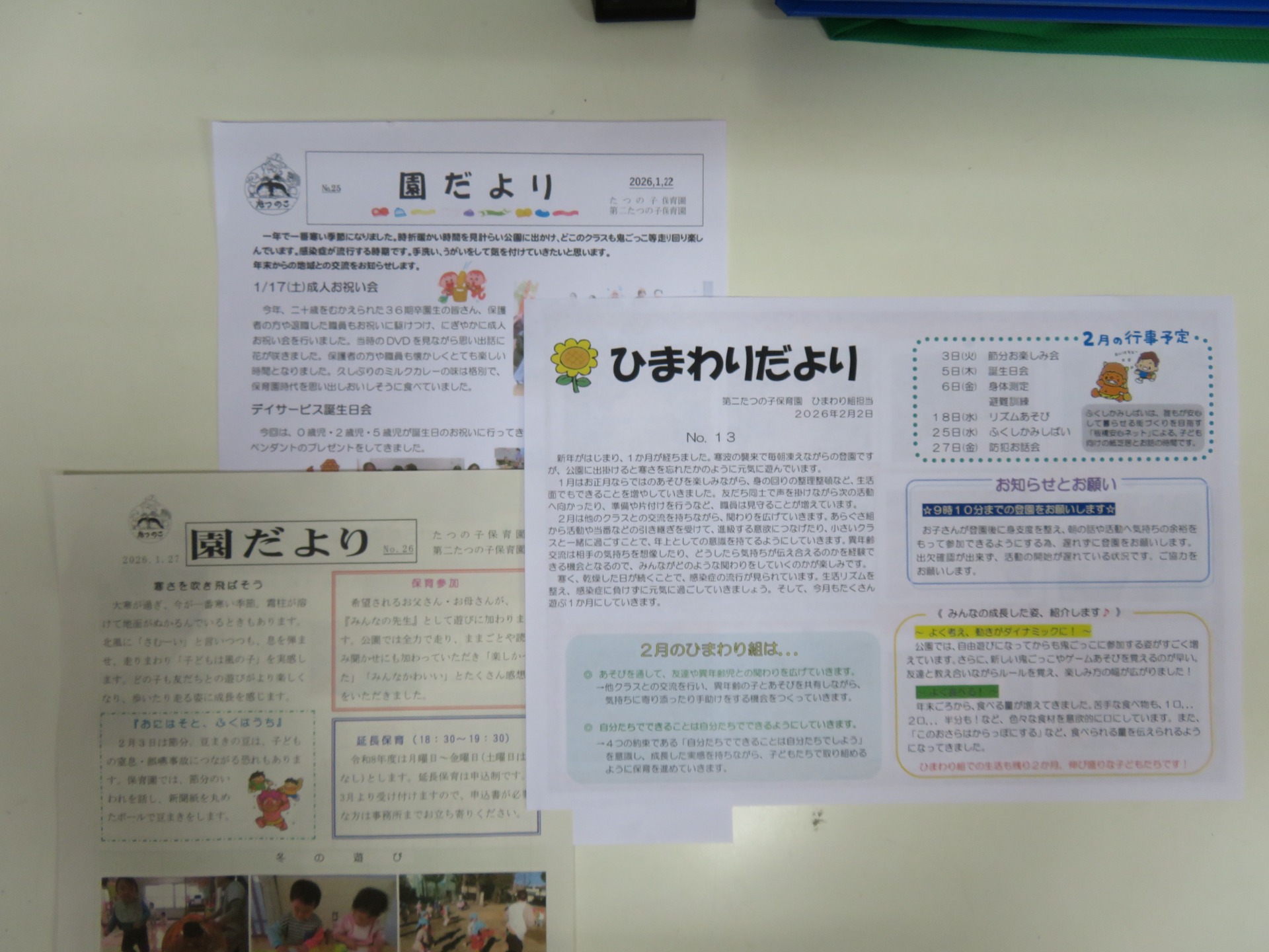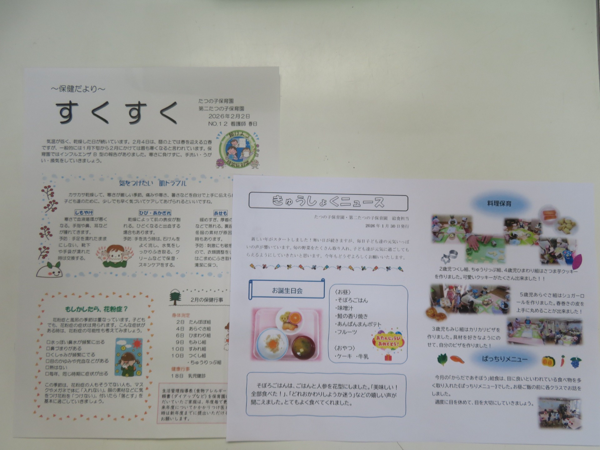 おたよりでお知らせ 2026-02-06 07:30:49 UTC 保育園からは、『園だより』や『クラスだより』、給食室から『きゅうしょくニュース』や保健のおたより『すくすく』など、色々なおたよりが発行されています。 クラスだよりでは、子どもの様子が写真入りで紹介されたり、保健だよりや給食ニュースでは、栄養士や看護師から、季節に合わせた情報が載せられたりと、楽しく役立つものになっています!