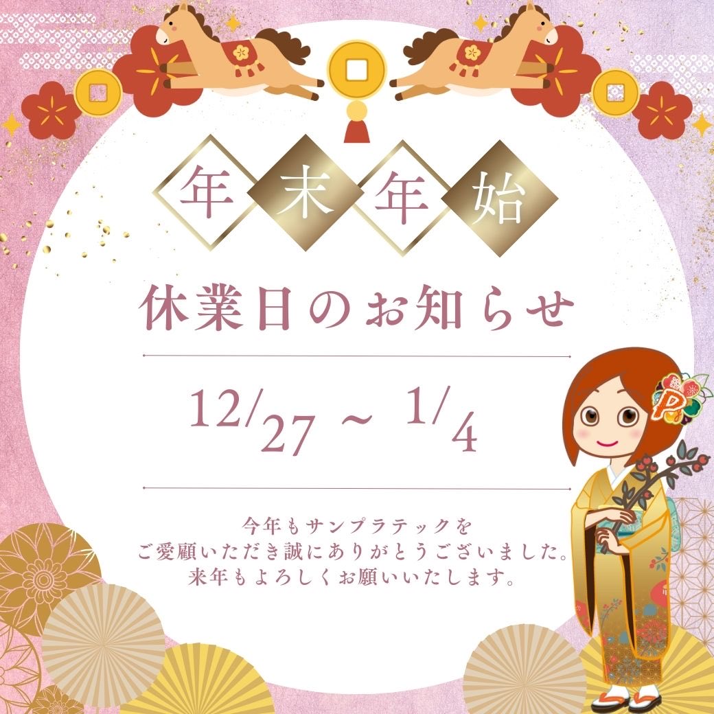 年末年始営業のお知らせ 2025-12-18 02:52:52 UTC 株式会社サンプラテックの年内営業は12/26(金)までとさせていただきます。 年始は2026年1月5日からの営業となります。 休業期間中のご注文・お問い合わせについては、2026年1月5日 (月)以降対応します。 皆様、何卒よろしくお願い申し上げます。