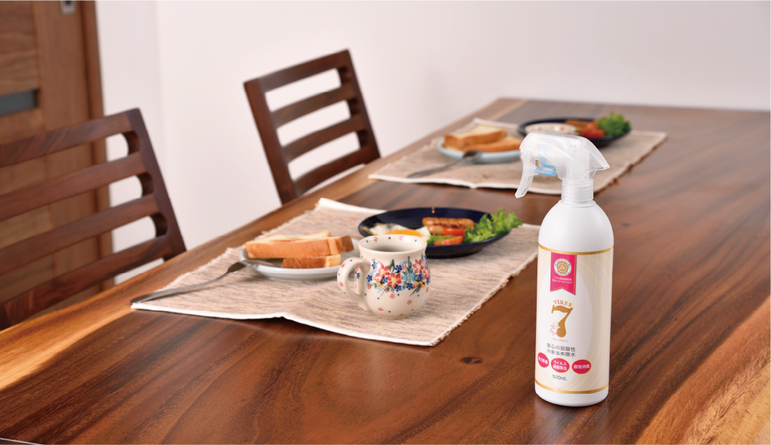 O-157・大腸菌などの食中毒対策から、インフルエンザ・新型コロナウイルスなどの感染症対策に効く、強力な除菌・消臭力を持つ『ウイレスセブン』。水に近い成分のため、人やペットにも安心してご使用いただけます。