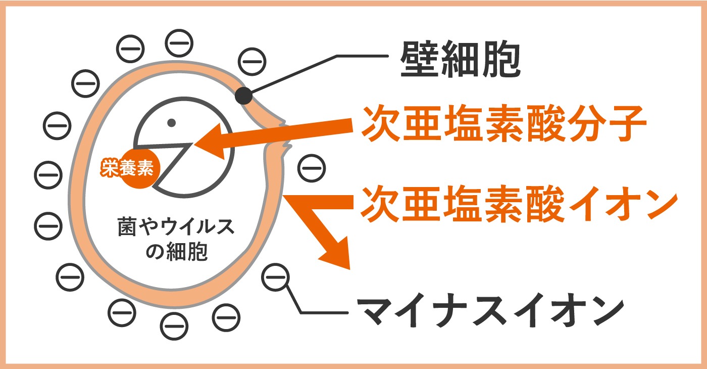 次亜塩素酸のメカニズムとしては、次亜塩素酸に含まれる次亜塩素酸分子が、菌やウイルスの栄養素に直接作用。菌を揮発させるアルコールとは異なり、内側から菌自体を死滅させていきます。同じく、次亜塩素酸に含まれる次亜塩素酸イオンが菌の外側の細胞膜を破壊。内側からも外側からも同時に菌を攻撃できるため、除菌力に即効性があり、抗菌効果も高いのです。