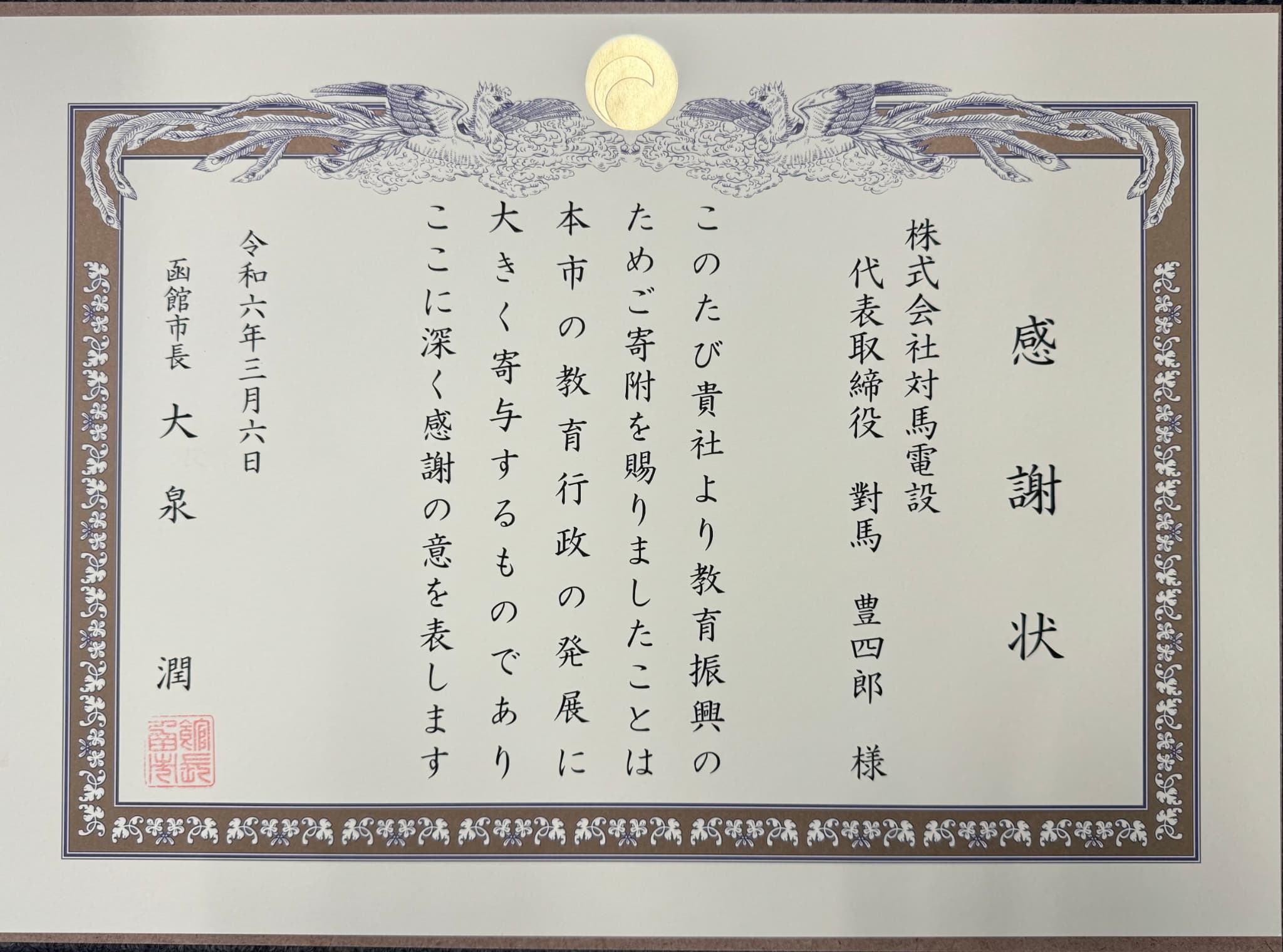 2024年3月6日 函館市より感謝状を受領しました。 2024-03-06 04:22:00 UTC 株式会社対馬電設(社長:對馬豊四郎、本社:函館市)は、本日、函館市の支援事業への教育復興に対し、函館市より感謝状を受領しましたのでお知らせいたします。 函館市の地域経済の様々な取り組みにご活用いただくことと共に、函館市のさらなる発展のために尽力して参ります。